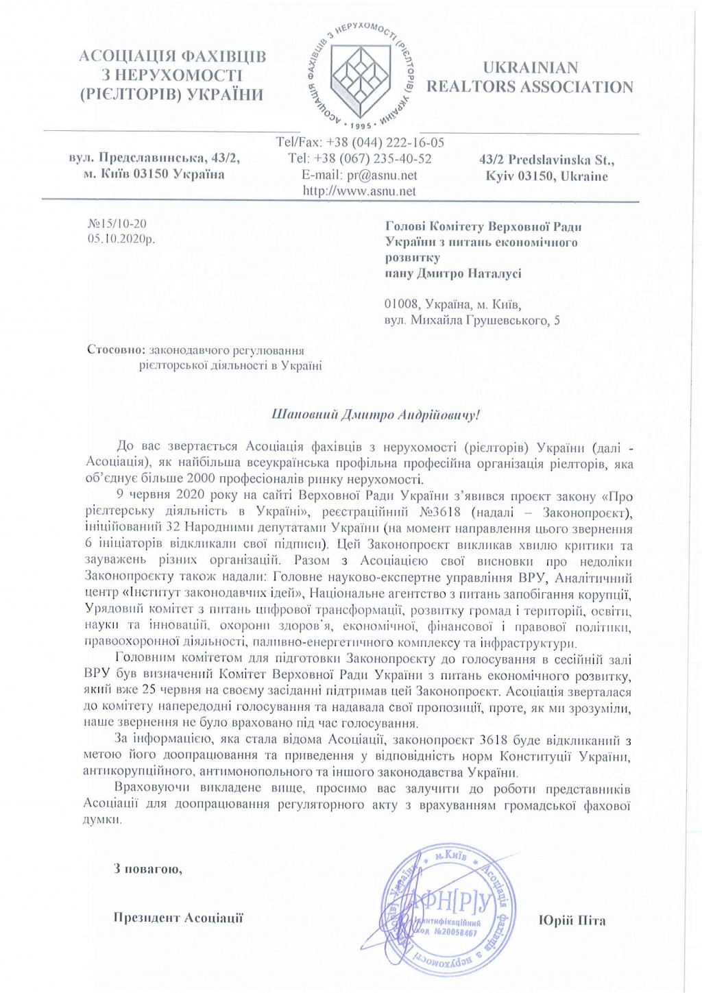 Асоціація фахівців з нерухомості (рієлторів) України направила лист-звернення Голові Комітету ВРУ з питань економічного розвитку Дмитру Наталусі в якому черговий раз підіймає питання необхідності залучення професійної спільноти до обговорення питання законодавчого регулювання рієлторської діяльності.