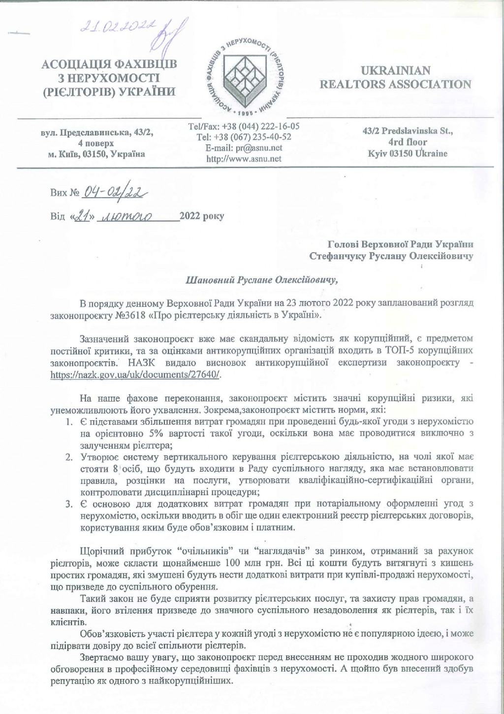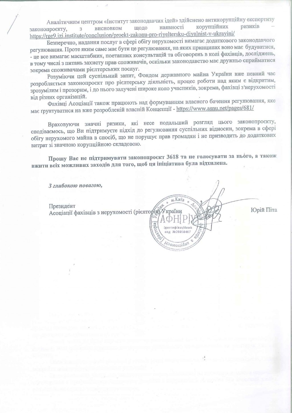 Асоціація фахівців з нерухомості (рієлторів) України закликає не голосувати за законопроєкт 3618!