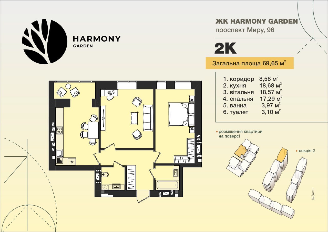 продаж 2к, район Виставка. Проспект миру 96. ЖК HARMONY GARDEN Площа 72 кв.м. 3/10 поверх Стан від забудовника