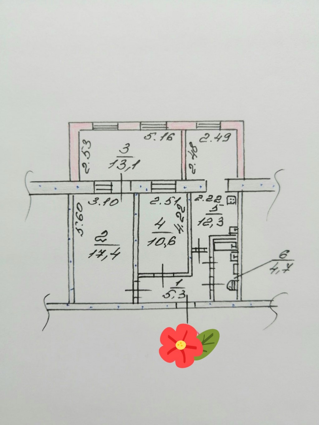- общая - 64 кв. м, жилая - 41.1 кв. м (17.4 кв. + 13.1 кв. м + 10.6 кв. м), коридор - 5.3 кв. м